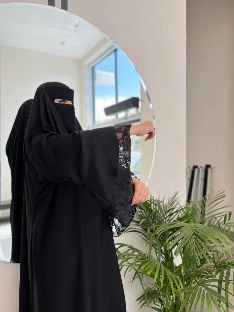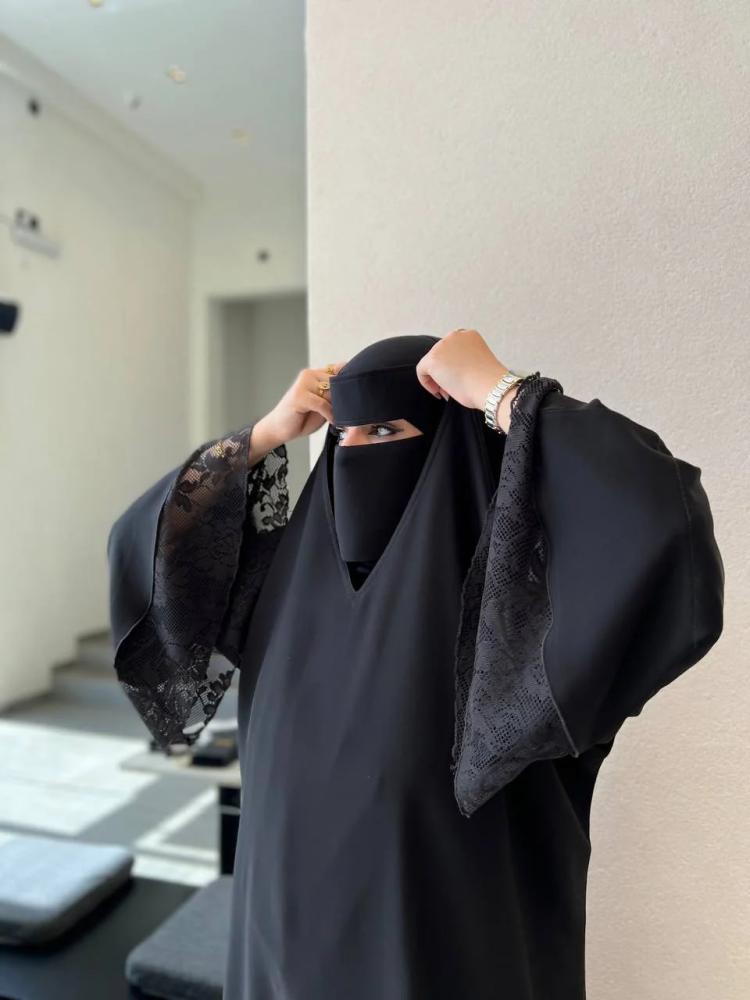 عباية رأس بكم فرنسي ودانتيل – قماش نواعم كوري | قصة نص كلوش