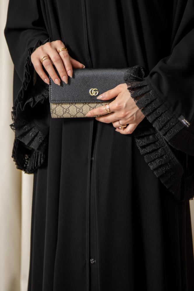 الكم؟ تصميم فرنسي أنثوي أنيق، مضاف له لمسة ناعمة ومميزة من دانتيل قوتشي تحدد الكم بطريقة فخمة تميز العباية عن غيرها وتخليها خيارك الأول في المناسبات والطلعات الرسمية.