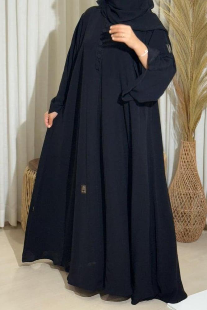 العباية مقفلة من الأمام لتمنحك راحة وخصوصية، ومصنوعة من قماش نواعم بلس كوري أصلي المعروف بنعومته وثبات لونه.