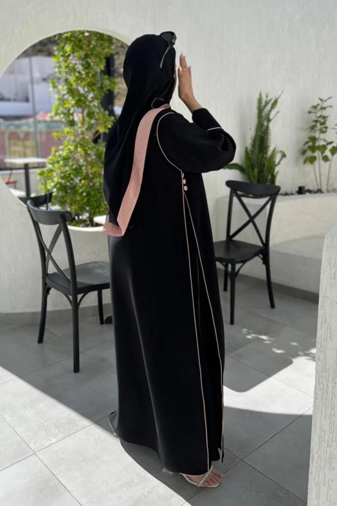 يأتي التصميم مع طرحة متناسقة تكمل من أناقة العباية وتمنحكِ إطلالة راقية وجذابة فالطرحة تتماشى تماماً مع تفاصيل العباية، مما يجعل تنسيق إطلالتك سريعاً وسهلاً سواء كانت المناسبة صباحية أو مسائية.